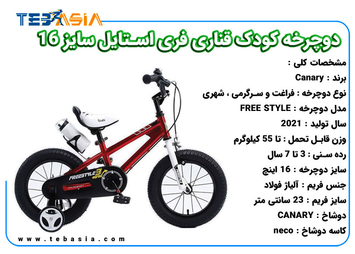 مشخصات فنی دوچرخه کودک قناری فری استایل سایز 16